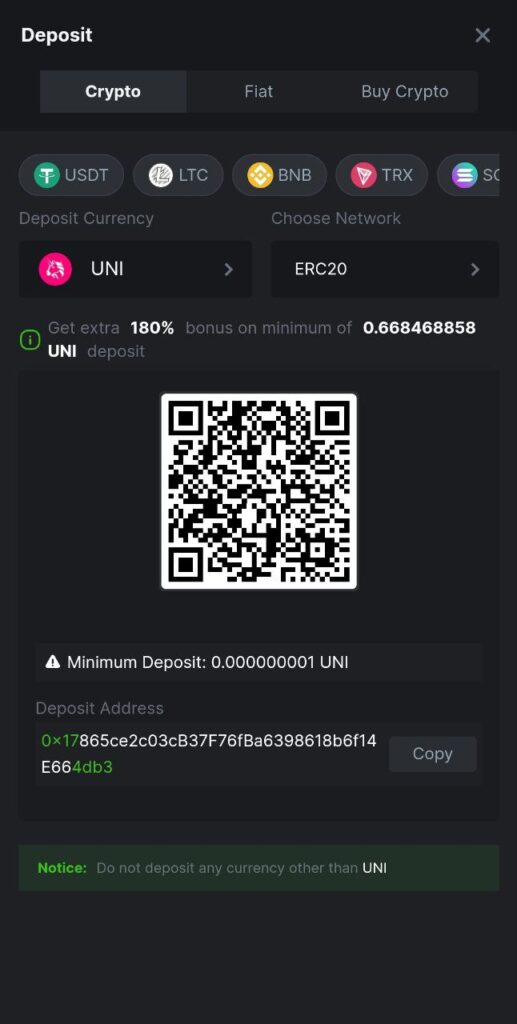 - For cryptocurrency transactions, select your cryptocurrency of choice to receive a unique deposit address and QR code. Employ your cryptocurrency wallet to dispatch the stipulated amount to the given address.