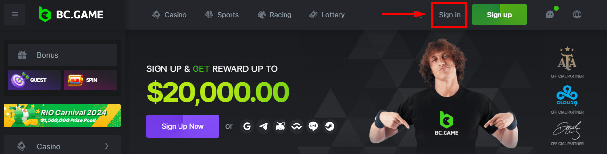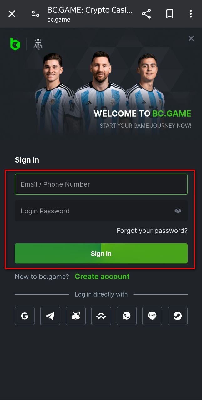 - Find and tap theSign in button. Once on the BC.Game site, look for the “Sign in” button, prominently displayed.