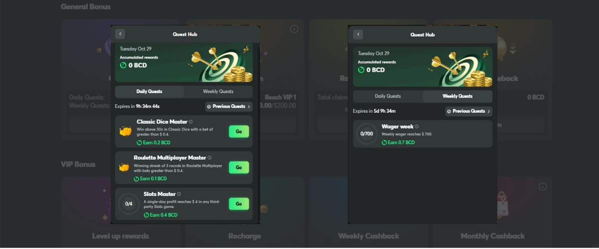 At BC.Game, players have the opportunity to earn additional rewards through daily and weekly task challenges. These tasks are designed to be engaging and rewarding, providing extra incentives for regular play. These tasks not only enhance the gaming experience but also allow players to maximize their earnings by completing achievable goals on a daily and weekly basis.