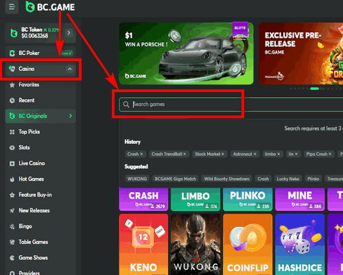 - Select a game. To locate the game you wish to play—e.g., Slots, Plinko, etc.—search the games or look through them.