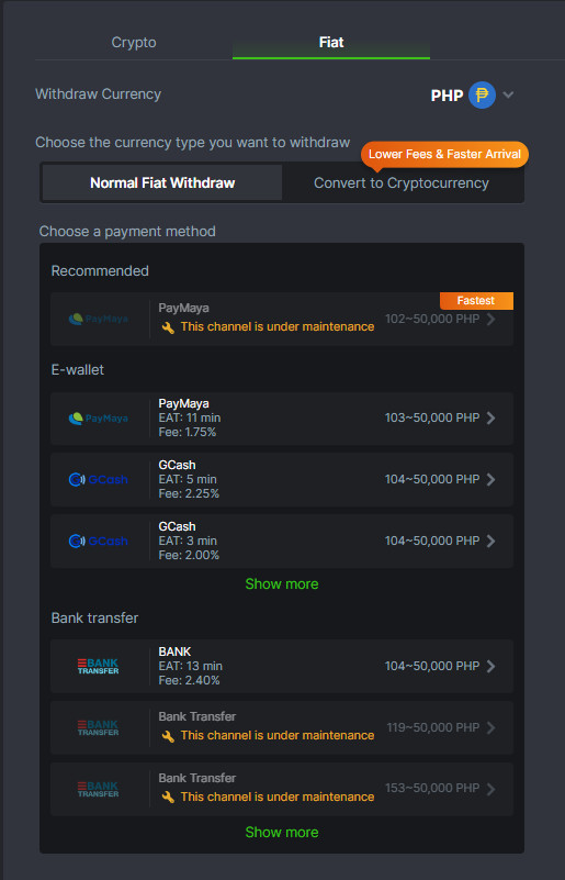• GCash. Withdrawals span from 104 to 50,000 PHP.