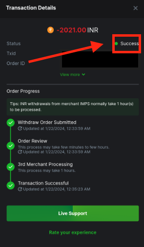 • Beyond 24 hours. If more than 24 hours have passed since the transaction was marked “Success” without the funds reflecting in your account, immediate action is recommended by contacting customer support.