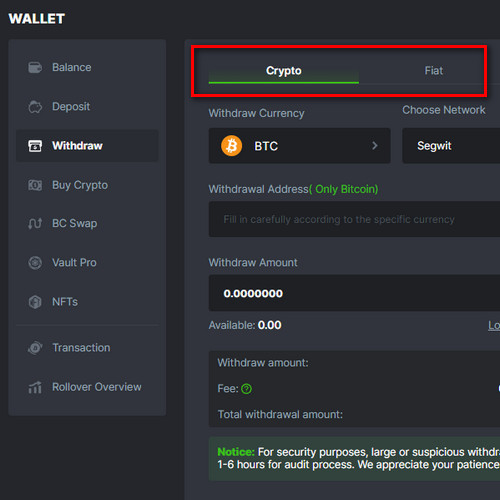 1. Choose cryptocurrency withdrawal. On the withdrawal page, opt for the cryptocurrency withdrawal option “Crypto”.